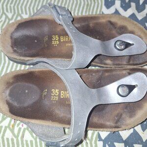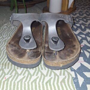 Very cute and boho silver Birkenstock sandles, in worn condition but stil in overall great shape and wear isnt visible when worn. Inner sole is obviously worn but besides that they're great!
