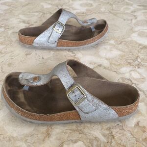 In good preowned condition original BIRKENSTOCK Gizeh sandals, a genuine classic in a lovely shimmering metallic silver Birko-Flor® upper . Anatomically formed cork and latex footbed, EVA sole, suede lining.