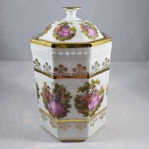 Birks Fragonard "Courting Couple" Patern Octagonal Container with Gold Trim