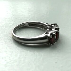 Birks 14k white gold triple garnets with diamonds accent ring. This size is around 7. Features three oval faceted red/orange claw-set garnets with 4 small diamonds accent stamped BIRKS JF 14K. Good used / vintage condition and item have signs of use as expected. Not in original ring case.
