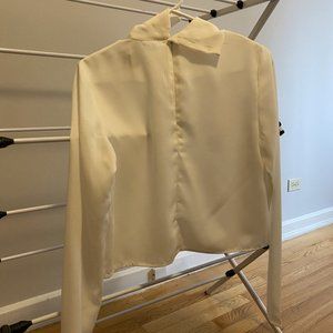 Long sleeved creamed blouse with draped neckline with a zipper at the front 100% polyester. Unworn. Suitable for formal or business casual wear.