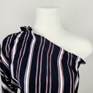 Bishop and Young Stripe One Shoulder Blouse in black, white and red stripes