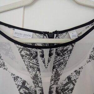 Upgrade your style with this Bisou Bisou geometric patterned black and white top, size L (fits slightly larger), complete with a cami underneath. A sleek and modern look that's perfect for any occasion!