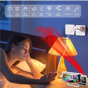 Biupky Digital projection bedroom alarm clock, 11 RGB colors, LED display, bedroom alarm clock with 180° projector, dual projection alarm for desktop; gaming.