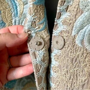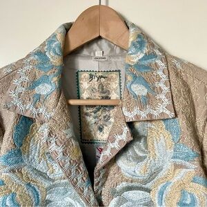 Biya Johnny Was Embroidered Floral Silk Blazer Size Large. Beige with blue embroidery. Heavily embroidered, all over embroidery. Collared blazer, snap button closure. Real side pockets. Exterior 100% silk. Artsy Lagenlook bohemian style. Size large, excellent condition.