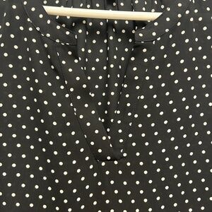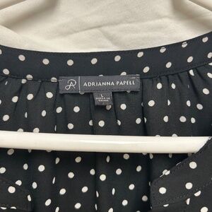 Elegant black Adrianna Papell blouse featuring a classic white polka dot pattern. Lightweight, flowy fabric with a flattering silhouette—perfect for work, special occasions, or stylish everyday wear. Gently worn and in excellent condition.