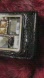 Clutch handbag, new with labels, faux alligator print vinyl decorated with 7 types of glamorous rhinestones gathered on right side, soft satin interior, metallic chain strap to switch from hand-held to shoulder.