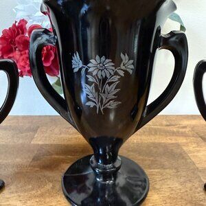 A rare and beautiful trio combining molded and etched motifs with elegant twin handles—perfect for centrepieces, gothic weddings, or moody vintage displays.