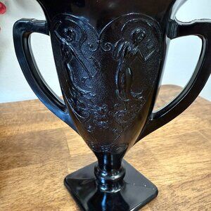 Black Amethyst Art Deco Style Trophy Vases Etched Floral and Dancing Nymph Decor