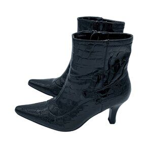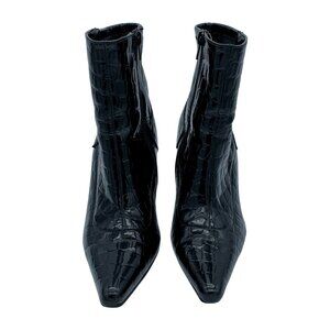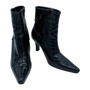 Black crocodile effect ankle boots. Pointed toe. Heel height is 3 inches. Faux leather. Listed as a size 7.