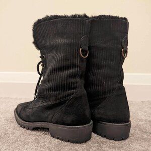 Designed with both form and function in mind, these boots feature a sleek black suede exterior that effortlessly complements any winter ensemble. The lace-up closure not only adds a touch of rugged charm but also ensures a secure and customizable fit, keeping you warm and cozy all season long