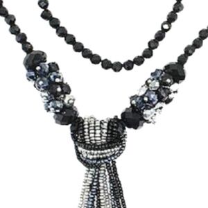 Make a bold statement with this elegant black beaded necklace featuring shimmering crystal accents and a dramatic 7.5-inch tassel drop.
