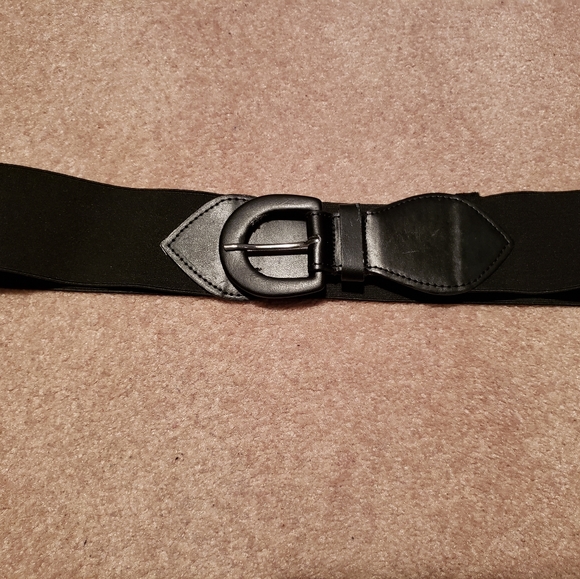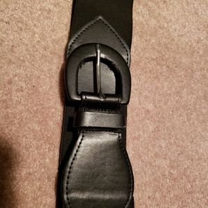 Black belt size large. Elastic band so very stretchy. Some wear inside buckle but not visible from front view. As seen in picture.