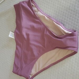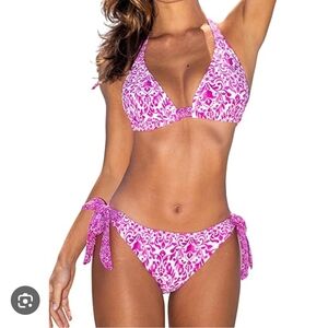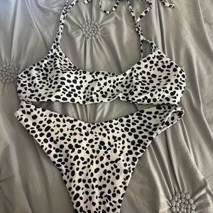 Stylish black bikini set with a tie-front top. Perfect for the beach or pool. Top can be tied in 9 different ways. High waisted thong bottoms. Please note the top is a Medium and the bottoms are a Large.
