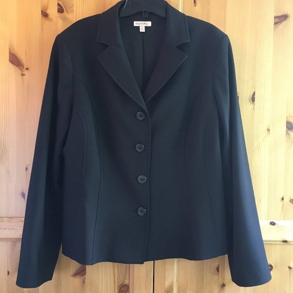 Classic black blazer, hardly worn--a wardrobe staple. In excellent condition. Four buttons, seaming detail front and back for a slimming fit. Modelled on size 10 mannequin and pinned back to give an idea of shape. Measurements shoulders 17", chest 20 1/2", waist 19 1/2", hips 22", length 23", sleeves 24 1/2". Fully lined.