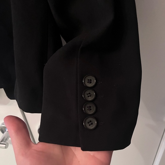 Cute black blazer with ruffle front detail. Perfect for work or dressing up for dinner.