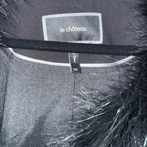 Le Chateaux size Large ; detachable fur collar : blazer is high hip to mid hip in length : two faux pockets in front : double button
