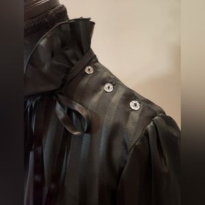 Beautiful Black Sheer Blouse. Satin style stripe detail. Amazing Ruffle neckline and sleeve. Clear button detail on shoulder. 100% Polyester.