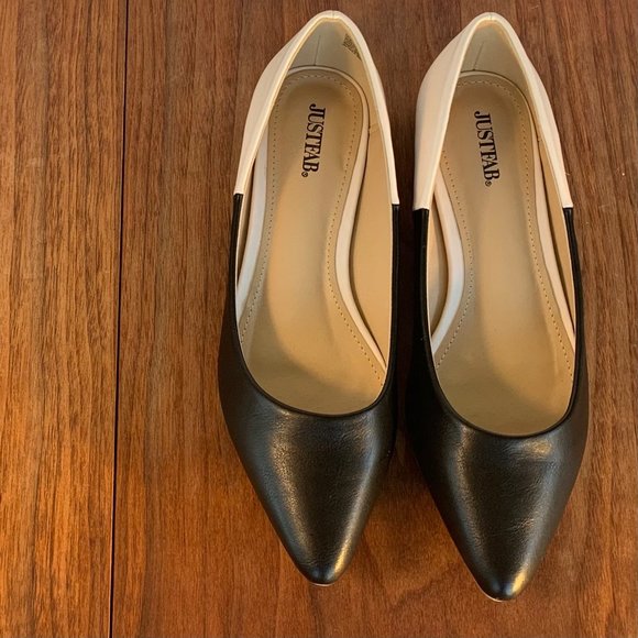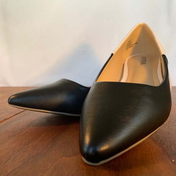 Two tone pointed flat in black and bone faux leather. Never worn, right out of the box.