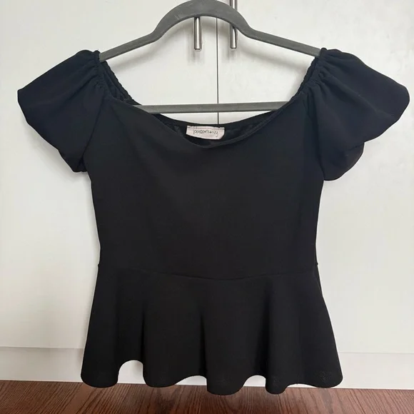 Elegant black bouffant off-shoulder top with a flattering peplum design, ruffles.