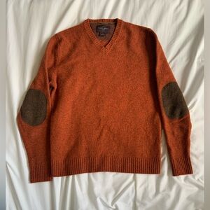 Vintage sweater lambswool unisex rust orange brown elbow patches preppy academia cozy soft knitwear fall fashion classic pullover menswear womenswear slim fit warm retro v-neck timeless layering piece classic timeless