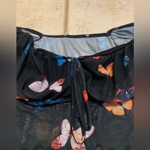 Add a whimsical touch to your wardrobe with this adorable sheer black crop top featuring vibrant multi-colored butterfly prints! Perfect for a trendy and airy look.