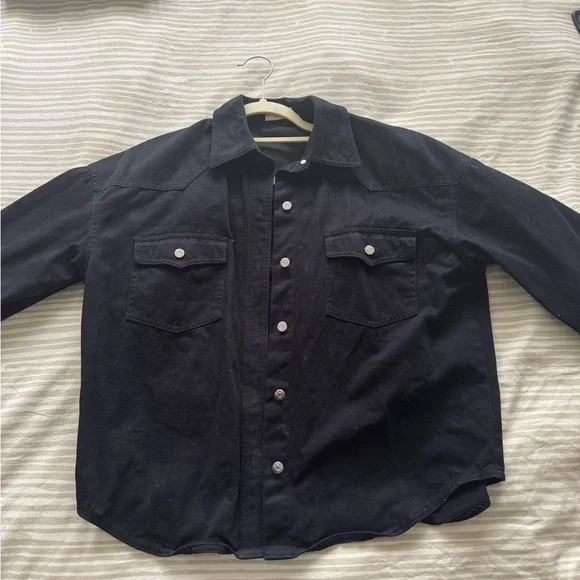 Stylish black button-up shirt with pockets. Material is cotton. Perfect jacket for spring!