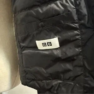 Sleek black quilted jacket. Features button closure. Ideal for layering.