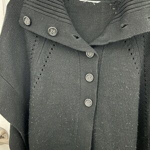 Stylish black knit poncho with button-up front. Features a ribbed collar for added elegance. Throw on over shirts or dresses. Pretty knit details on each side. Some lint balls, but not nearly as noticeable as the bright pictures would indicate! Something about that brightness shows every ball of fluff I guess. Size tag was removed as it was very itchy, but it indicated OS for one size. Please pay attention to measurements to ensure fit: shoulder tip to shoulder tip is 35”. From top of shoulder to lowest point is 29”.