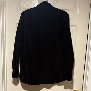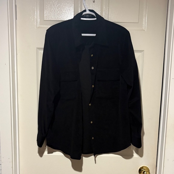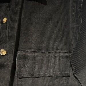 Stylish black button-up shirt with front pockets. Perfect for winter. Black corduroy. New with out tags. Says a Med but Ptp is 22 “. 28” long.