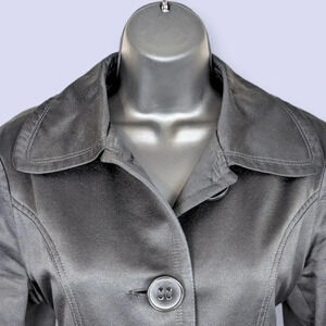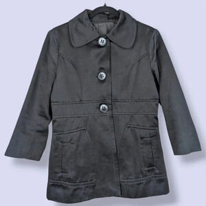 This contemporary jacket by Amisu is sleek and well-fitted. It has 2 front pockets, a front button closure, and decorative back buttons. It also has a full black lining, 3/4 sleeves, and is somewhat longer than the average jacket.