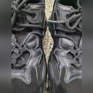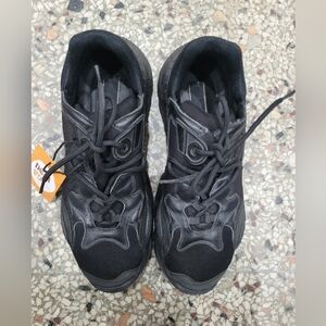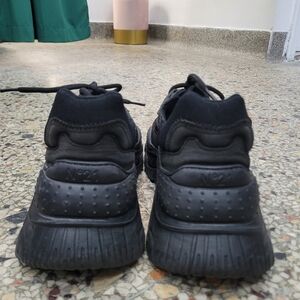 These black sneakers feature a bold, chunky silhouette with multiple layers of mesh and synthetic materials. The all-black design is complemented by a thick, textured rubber sole and wave-like overlays, making them a statement piece for any streetwear enthusiast.