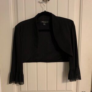 Black shrug with ruffled sleeves. Dress up anything with this classic shrug. Soft and light. Perfect for those nights you need just a little something when the sun starts going down.