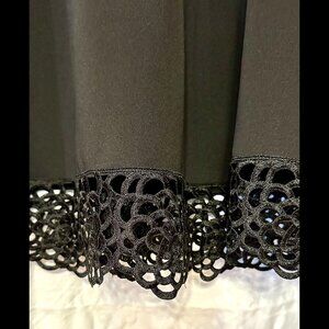 This is a sleeveless, knee-length A-line dress, featuring a flattering V-neckline and a structured, tailored bodice that enhances the waist. The hemline is decorated with intricate lace cut-out detailing, adding a touch of elegance and sophistication to the otherwise simple design. This dress is versatile and ideal for occasions ranging from cocktail parties to semi-formal events.