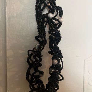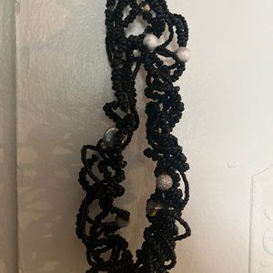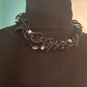 This coiled necklace is made with several strands of black beads, with an occasional white bead for accent. This necklace is not a choker but sits high, so great with scoop necks. Toggle closure at the back.