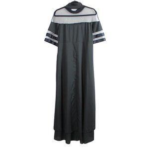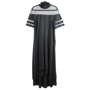 A unique tiered maxi dress in a dramatic black hue with contrast mesh. The material is lightweight and has a gentle flowy movement. Easy to slip on and off with the zipper closure on the side. A great choice for celebrations, prom, parties, cocktails and gala events. Perfect for summer. New with tags. Excellent condition.
