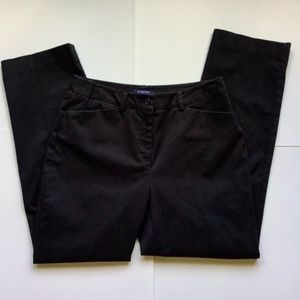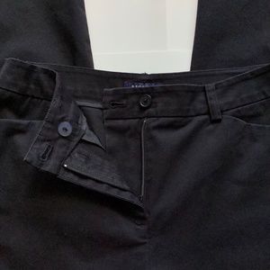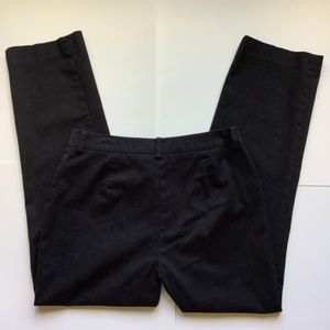 A great, streamlined pair of black crisp (but soft!) cotton pants. Straight cut, functional front pockets, and pocketless in the back. Comfortable enough to be casual, but also supes appropriate for work.