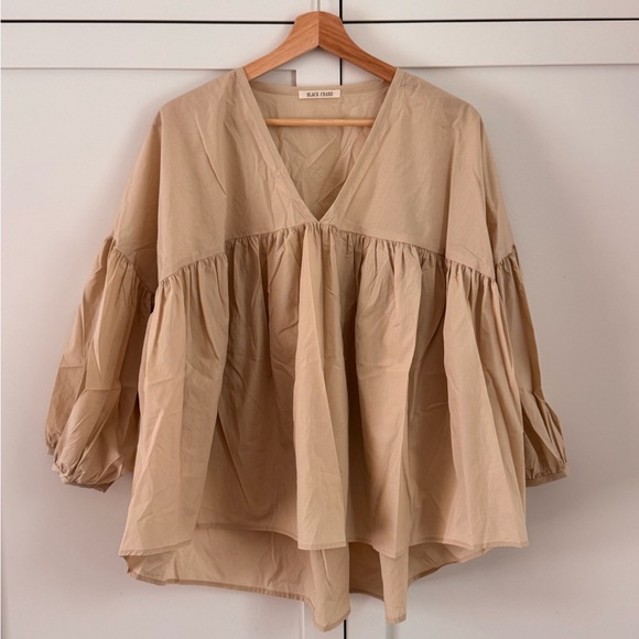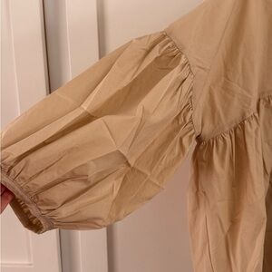 A beautiful balloon sleeve top in golden tan sateen cotton. Full swing silhouette with high / low hem, v neck, dropped shoulders and voluminous sleeves with gathered cuffs. 100% cotton sateen.