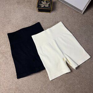 Set of two seamless ribbed biker shorts in black and ivory. High-waisted fit with stretchy, sculpting fabric.
