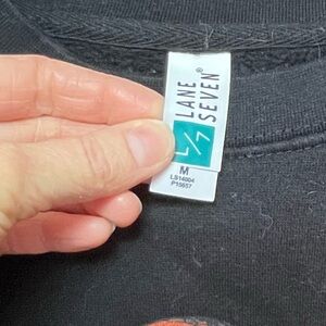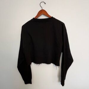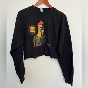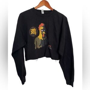 Stylish black cropped sweatshirt. Features a colorful rooster graphic. Perfect for casual wear.