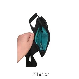 This purse boats a vibrant teal interior, with an exterior and interior pocket.