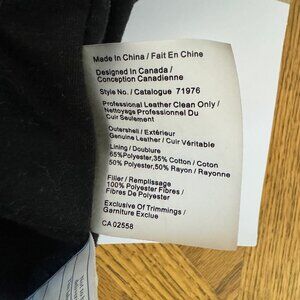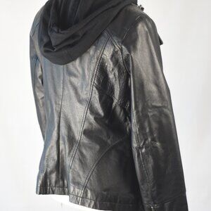 Black genuine leather jacket with fabric (poly/cotton) lining and detachable hood.