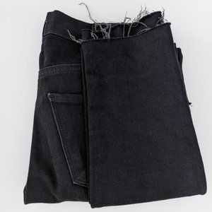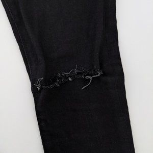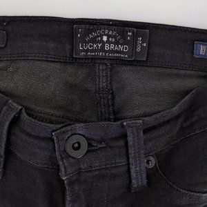 Mid-rise Lucky brand jeans distressed at the knee and cut at the bottom.