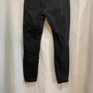 Distressed patches on the knees, raw edges at the ankles.