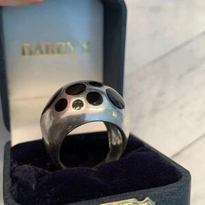 A statement piece! I love this ring. Size 8. Sterling silver dome ring with black inlay circles. A heavy ring.