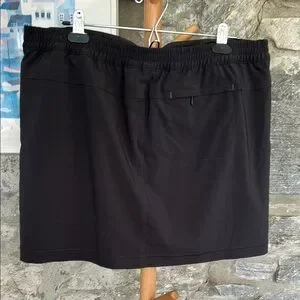 Stylish black skort with drawstring detail. Perfect for casual wear. Elastic at back of waist. Front rockeurs and one back pocket with zipper. Excellent for travel. Measurements in pics: waist and length. Never put in dryer.