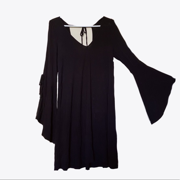 Stretchy soft black dress, slits on sides of sleeves, flowy bottom half sleeves, just above the knee.