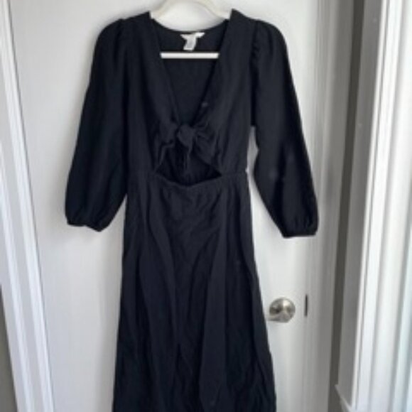H&M black dress. Can be easily dressed up or down. 100% cotton, has some natural stretch but fitted overall. Feels like linen.