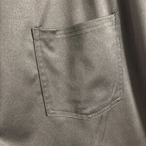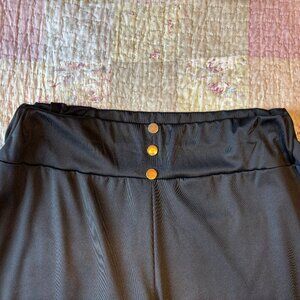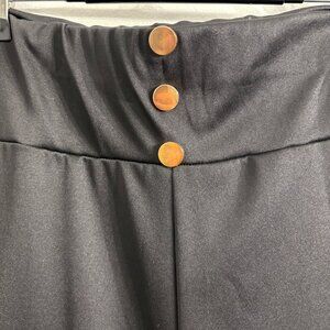 Black dress pants with stretchy waist, front button detail, and two back pockets.