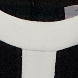 Black and white sleeveless dress with white trim around neck, bottom, sides and front.